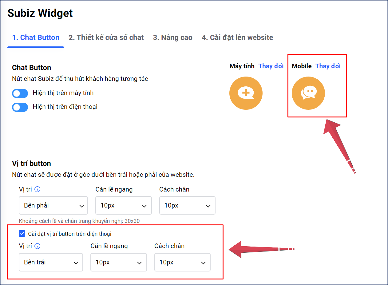 - Vị trí button trên điện thoại: Bạn có thể đặt button sang trái hoặc phải website, điều chỉnh vị trí chính xác của button so với căn lề ngang và cách chân trang.