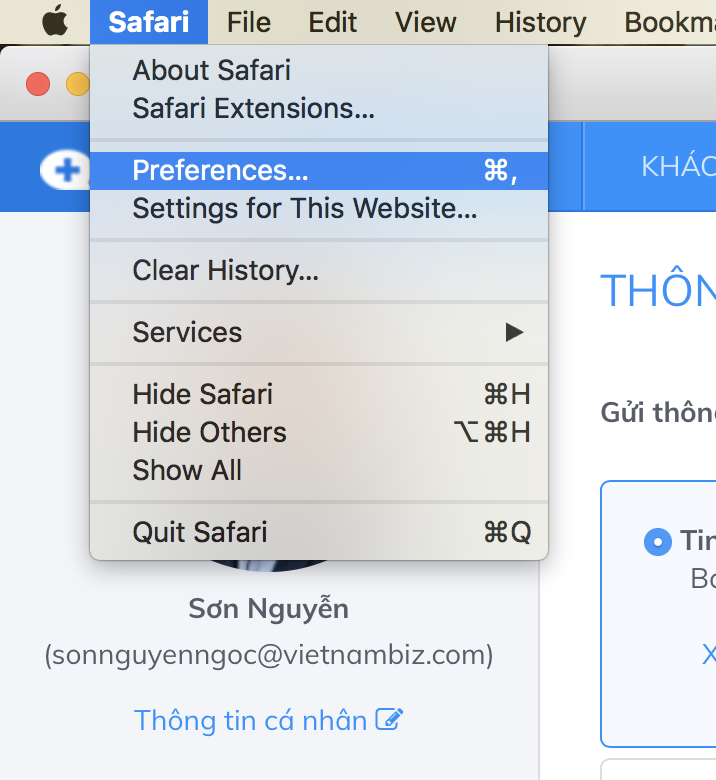 {% tab title="Safari" %} Bước 1: Vào Safari > Preferences